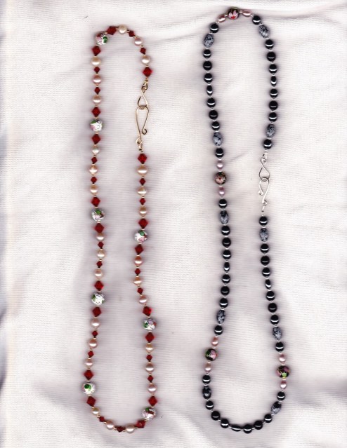 I’m not sure about my design skills anymore, but I think these may have come out okay.  They are both short — longer than choker length but not by a whole lot.  The one on the left is Swarovski crystal in Siam (a deep red), peach colored freshwater pearls, white cloisonné, small gold-filled spacer beads and a handmade gold-filled wire clasp.