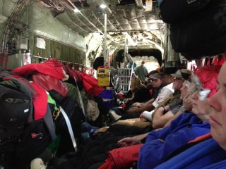 The Rocket Scientist just texted a picture of him and other scientists in the plane that will take him from Christchurch, New Zealand to McMurdo Station, Antarctica.  They have been prevented from going for days, and yesterday they got an hour out and had to turn back because of engine trouble.  He left on December 29, and will be back in late February, having spent weeks on the Antarctic ice testing drills and drill automation software.