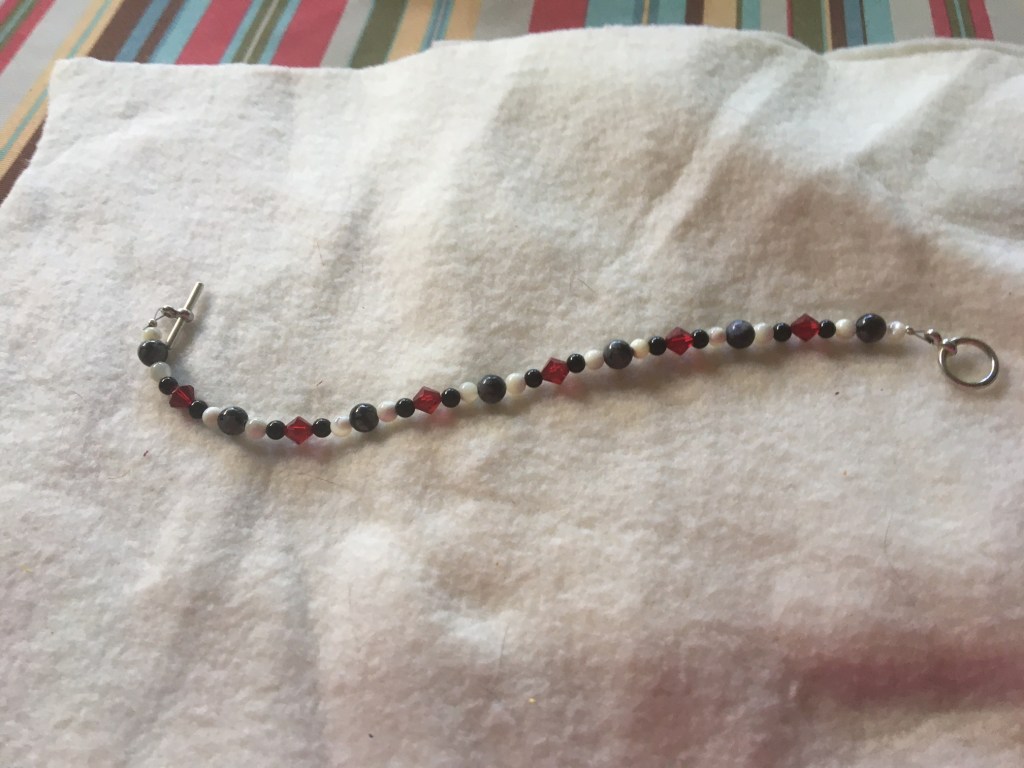 It’s not a particularly interesting bracelet, although the color scheme (black, white, and red) fills a gap in my jewelry. (Since I was not sure whether I could complete it, I used relatively inexpensive beads – I wasn’t going to pull out the lapis or malachite for this. The most expensive item I used was Swarovski.) Other than design (which didn’t take very long) the bracelet took me about forty to forty-five minutes to make, as opposed to the two hours it took me last time I tried to make one. I found it frustrating at times, but it didn’t reduce me to tears. My tremors made it somewhat difficult, but my eyesight was more of a problem.